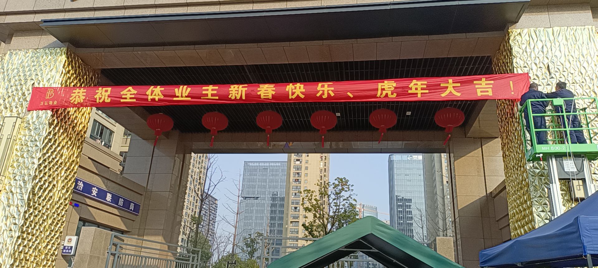 紅幅鋪展,年味在此刻漸漸蔓延開來,大紅的橫幅、燈籠喜氣洋洋,濃濃的年味濃縮于一字一句間。一盞盞精致的紅燈籠滿載著節日的祝福,流淌著溫馨和美好,美好的節日布置帶著物業人員們的美好祝福,為即將來臨的春節增添了濃濃的味道。