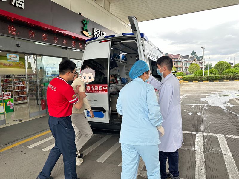 公司建盈站當班領班吳建鑫正給過往車輛加油,一輛黑色的車子快速駛入站內停下,車窗搖下只見一位面色慘白的駕駛員正在揮手,吳建鑫一邊迅速示意同事疏導車輛,一邊快步來到駕駛室旁。據了解,該男子因長時間未進食感到身體難受,伴有手臂發麻喘不上氣的情況。吳建鑫隨即迅速采取行動,將男子攙扶進店休息并撥打120,精準報出加油站位置并描述患者癥狀。等待救護車的過程中,員工全程守護在顧客身邊,密切觀察他的情況。直到救護車到達,開票員戴偉臣將顧客攙扶上車,所有人懸著的心才落地。