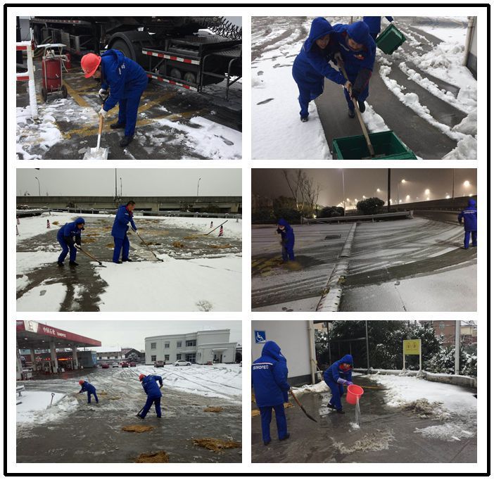低溫雨雪天氣,交投能源公司及時應對,從人力、物資、供應等多方面作出保障。公司建盈加油站的一線員工們在站長馮芳的帶領下,經過連續兩天的晝夜清掃努力,在站內開辟出一條條安全行駛、行走通道。保證每天運營前,清除油站出入口冰雪,鋪設防滑材料,并在運營時段隨時清掃,防止積雪結冰,確保顧客們安全出行。